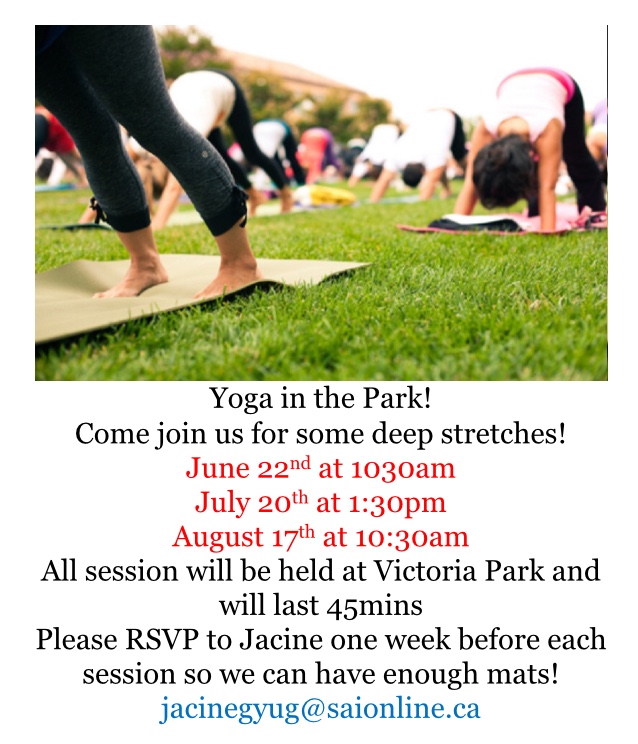 Come join us for some deep stretches! Victoria Park July 20th, 2018 1:30pm to 2:15pm Please RSVP to Jacine one week before so we can have enough mats. jacinegyug@sai.websitepro.hosting