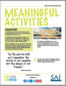 Our primary role is to teach feelings of companionship, love of self, love of others, and engagement in community life – not to get rid of behaviours, teach living skills, or make people productive citizens. We do not diminish the importance of these aforementioned values; however, they require a foundation of feeling safe and loved to see real success.